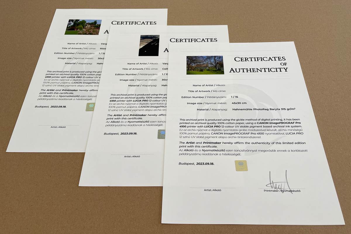 A giclée nyomat nem csupán reprodukció, hanem archiválási minőségű műtárgy. Ennek hiteles igazolására kérhető A4-es tanúsítvány, amely dokumentálja a felhasznált technológiát, az alapanyagokat és a példányszámot.